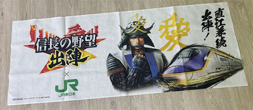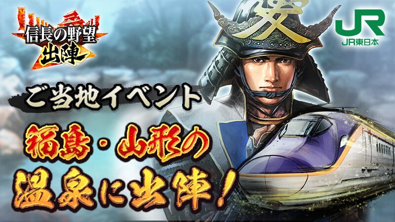 | 福島・山形の温泉に出陣! | 4/16~5/28 | 東京駅、大宮駅 福島駅、山形駅 飯坂温泉、蔵王温泉 磐梯熱海温泉 かみのやま温泉 | ・称号「福島・山形の温泉に出陣!」 ・【福島・山形に出陣】直江兼続 ・アイコン(E8系) ・フレーム(E8系) | オリジナル手ぬぐい |