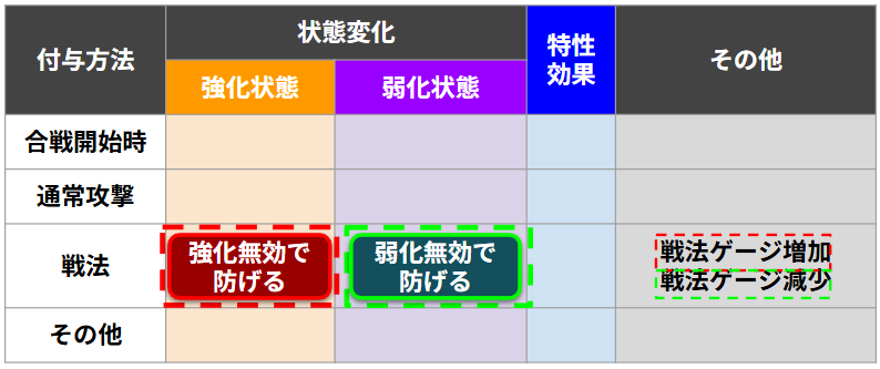 言い方を変えればここに記載されている効果を付与する戦法の効果を無効化できると判断できます。