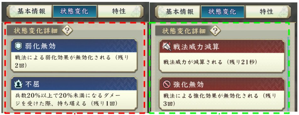合戦中の状態変化欄には、その部隊に付与されている強化状態と弱化状態が表示されています。