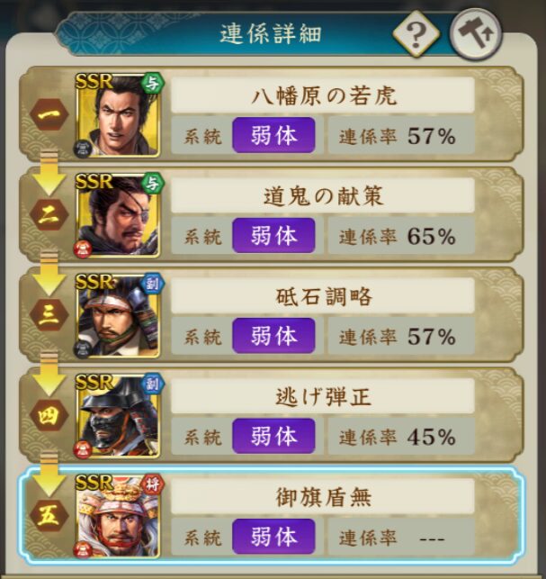 | 【御旗盾無】 武田信玄 | 【動如雷震】 | 自身大将時、合戦開始時に 全味方武田家部隊の戦法ゲージ上昇 |
