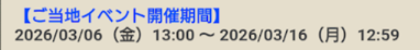 | イベント期間 | スポット 表示期間 | 場所 | ゲーム内 報酬 | 配布記念品 (数量限定) |
