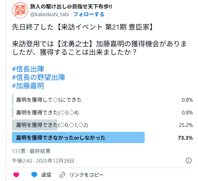 アンケート結果(来訪許可印の購入比率)やPU武将であった【沈勇之士】加藤嘉明の登用率についても掲載しています。