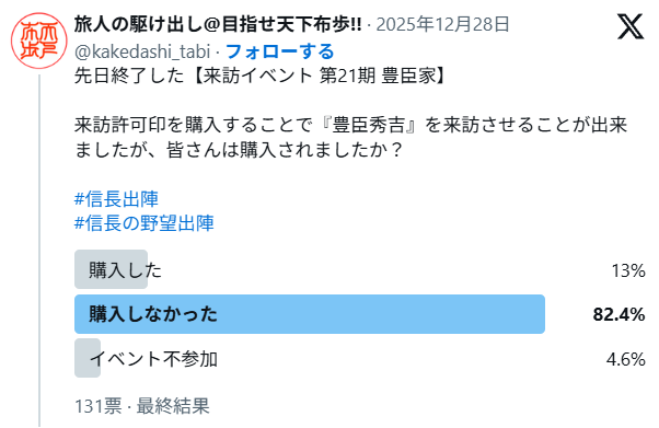 来訪イベント毎にX(旧Twitter)にて行ったアンケートの結果を集計した結果、約13%の方が来訪許可印を購入されていたことが分かりました。