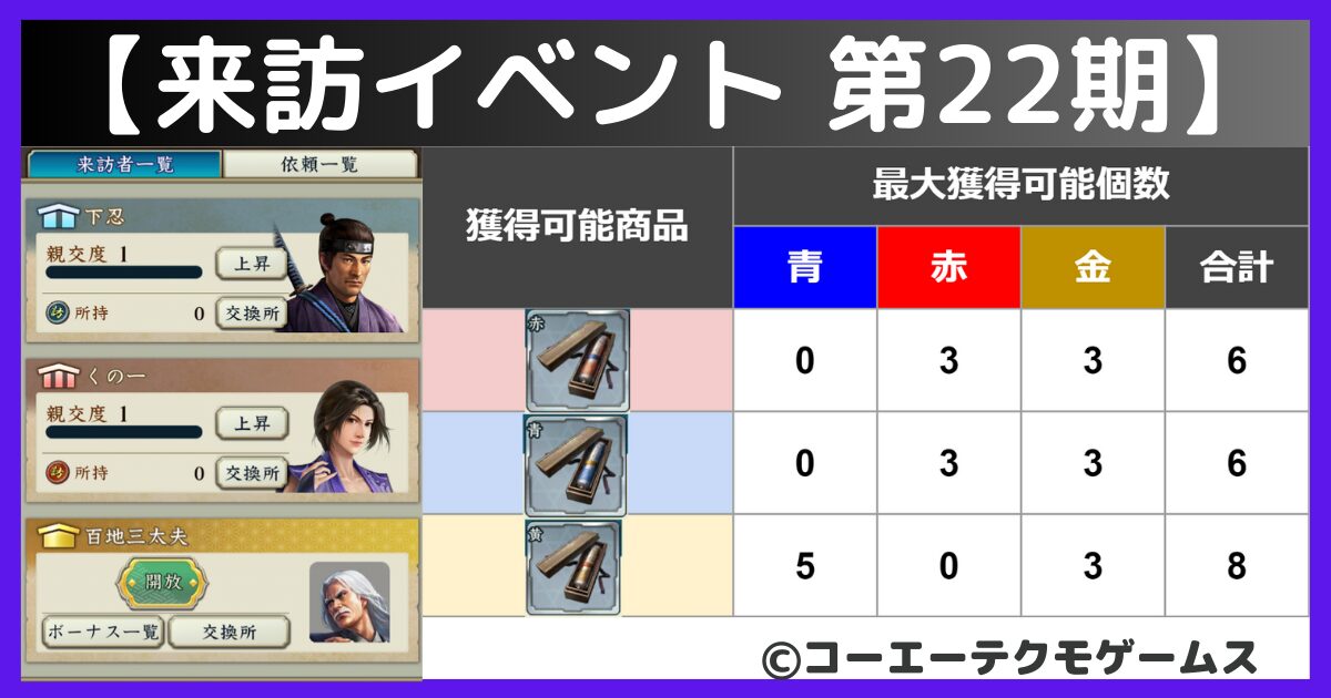 この記事では『信長の野望 出陣』の期間限定イベントである【来訪イベント 第22期 忍者】について解説いたします。