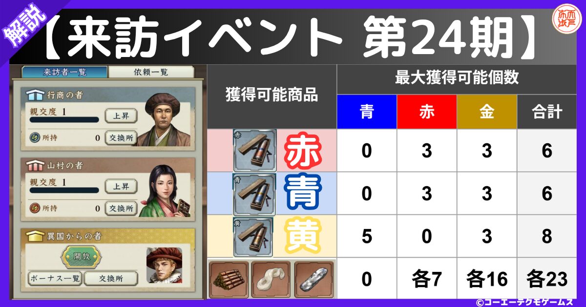 この記事では、2026年3月19日から開催された信長出陣(信長の野望 出陣)の期間限定イベントである【来訪イベント 第24期 商人】について解説しています。