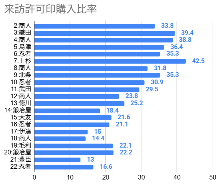 来訪イベントでは【商人】【忍者】【鍛冶屋】に加えて【各大名家】がローテーションで来訪してきます。