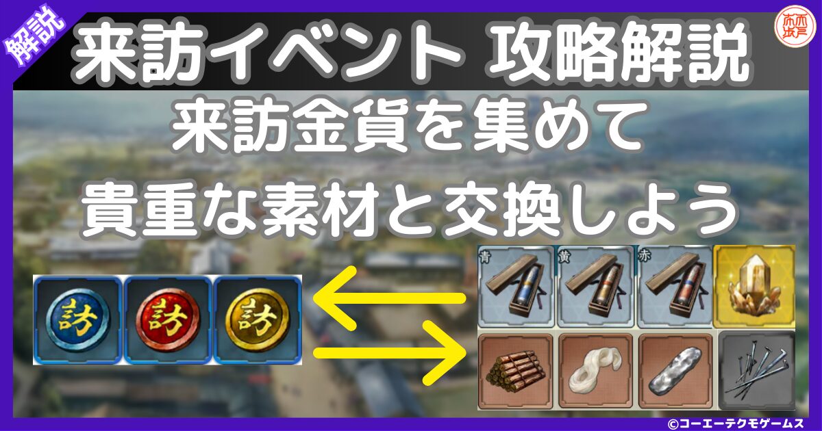 来訪イベントは『合戦要素が無い技術素材集めのためのイベント』です。技術素材の収集難易度はそれほど高くなく初心者の方でもしっかりと報酬を獲得できる良心的なイベントとなっています。