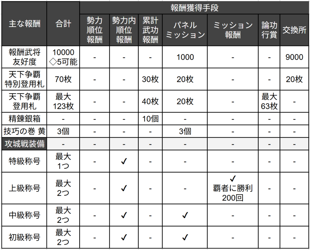 天下争覇は攻城戦や勢力戦と異なり、覚醒報酬がありません。