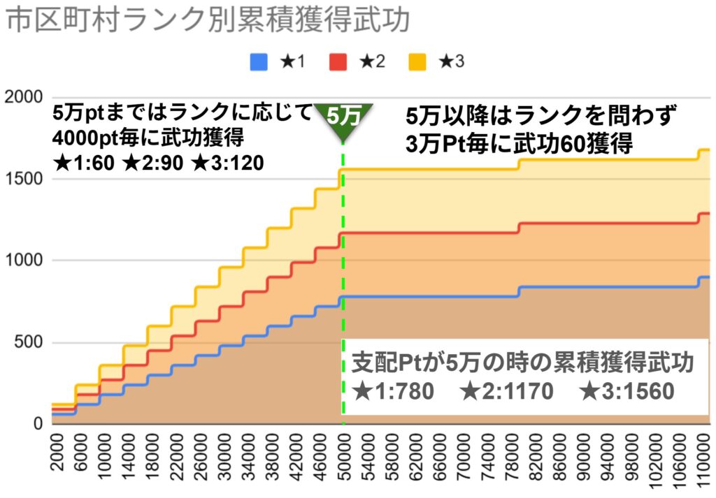市区町村のランクが高いほど獲得できる武功は多くなります。