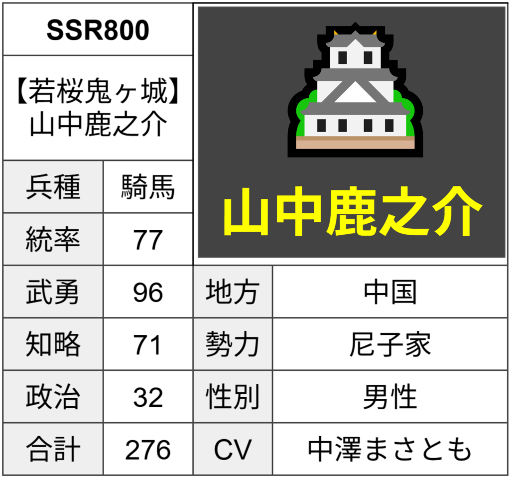 中国地方は90後半の知略を誇る知略自慢のSSR武将が多いですが、武勇自慢SSRは少ないです。鹿之介は貴重な人財といえます。