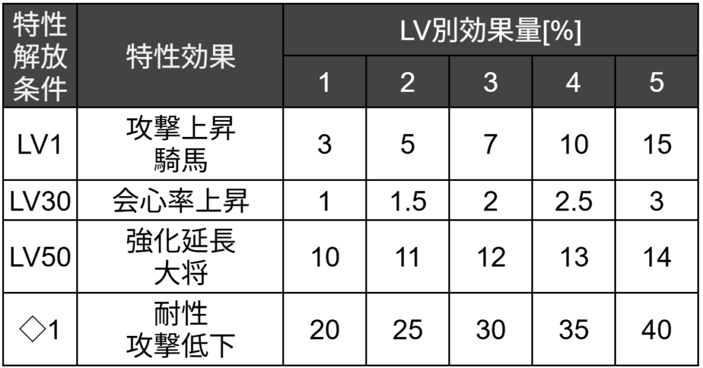 【攻撃上昇・騎馬】は兵種的に相性が良くて扱いやすい特性と言えます。