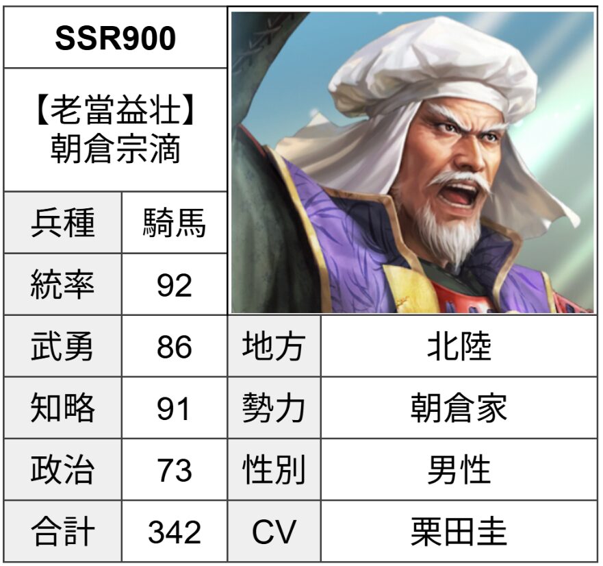 | 【老當益壮】 朝倉宗滴 | 900 | 騎馬 | 16 | 小範囲 | 知略攻撃 | 250 |