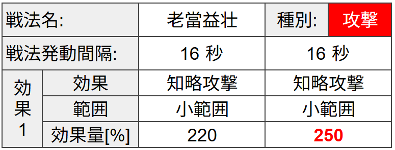 | 武将名 | 初期 威名 | 兵種 | 発動 速度 | 対象 | 効果 | 効果量 |