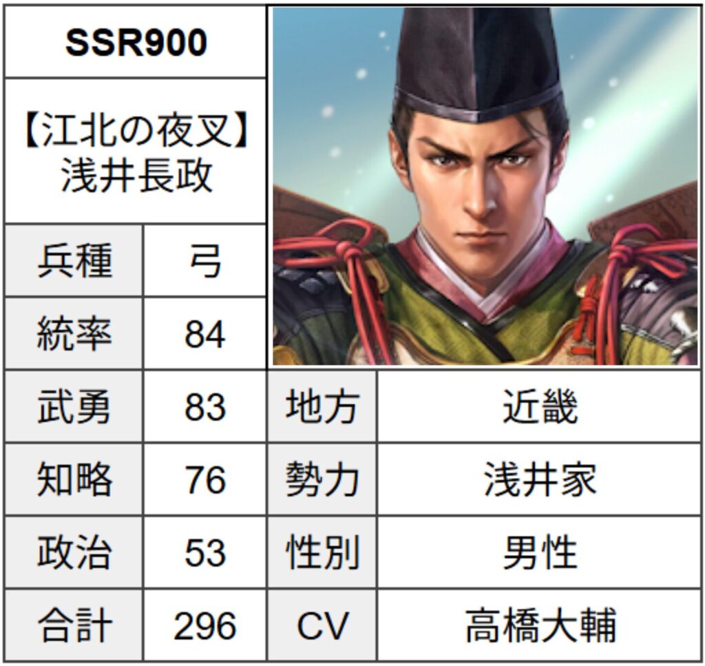 【江北の夜叉】 浅井長政 | SSR 900 | 弓 | 近畿 | 296 | 84 | 83 | 76 | 53 | 通常登用 |