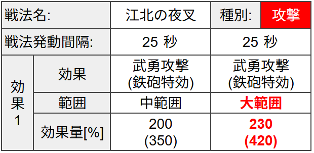 【江北の夜叉】 浅井長政 | 25秒 | 武勇攻撃 (鉄砲特効) | 230 (420) | – |