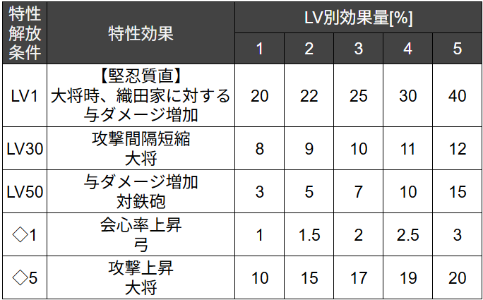 特性を強化することで、織田家鉄砲隊に対しては常時与ダメ増加55%に到達可能となる。