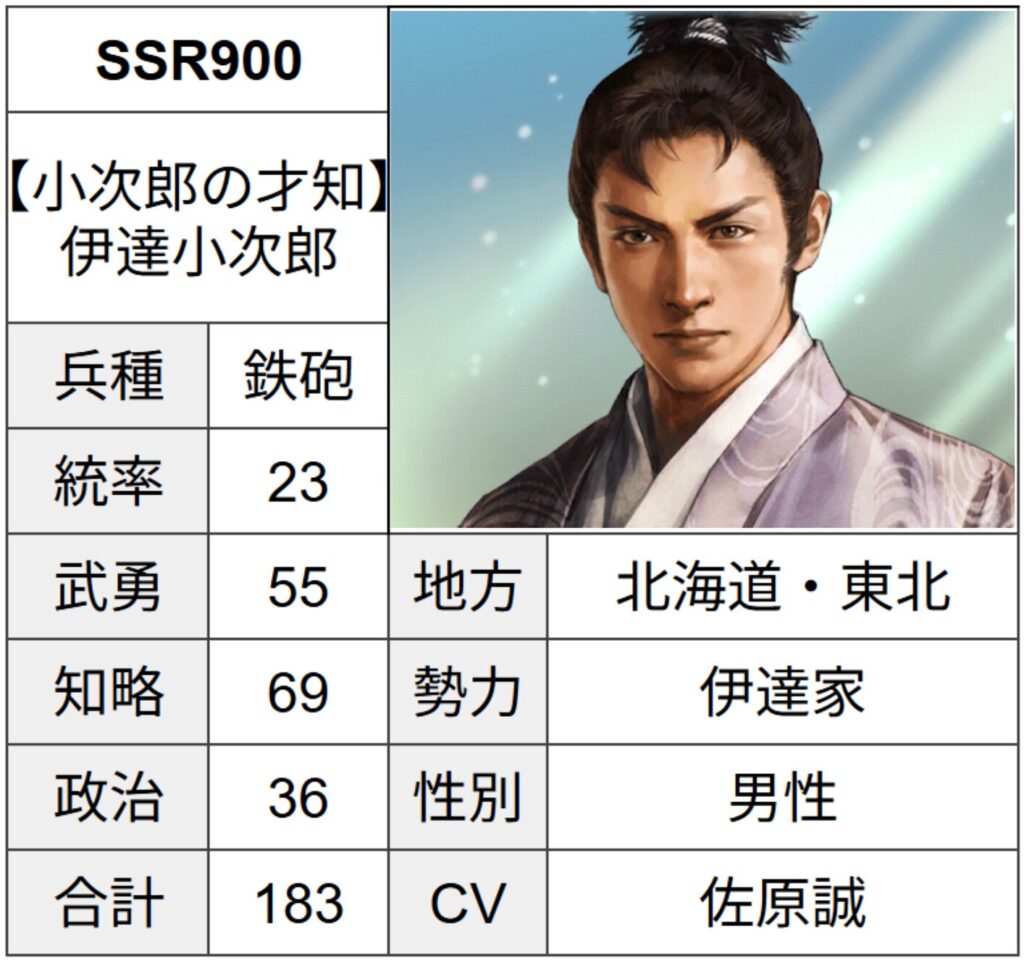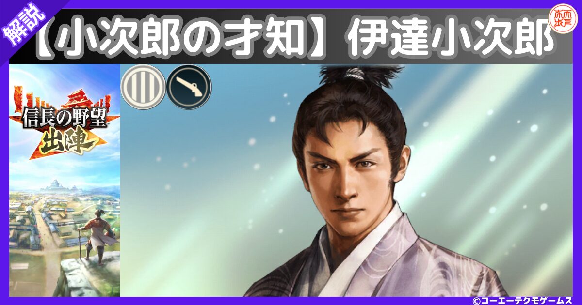 【小次郎の才知】伊達小次郎の戦法や特性・能力・官職(所縁武将)に加えて、運用案および育て方についても解説しております。