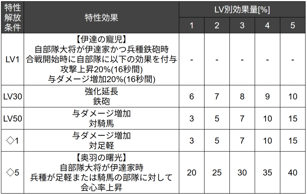 効果は自部隊の大将が伊達家所属かつ兵種が鉄砲時、合戦開始時に自部隊へ攻撃上昇と与ダメージ増加を付与です。 効果時間はそれぞれ16秒間で、効果量はどちらも20%となります。