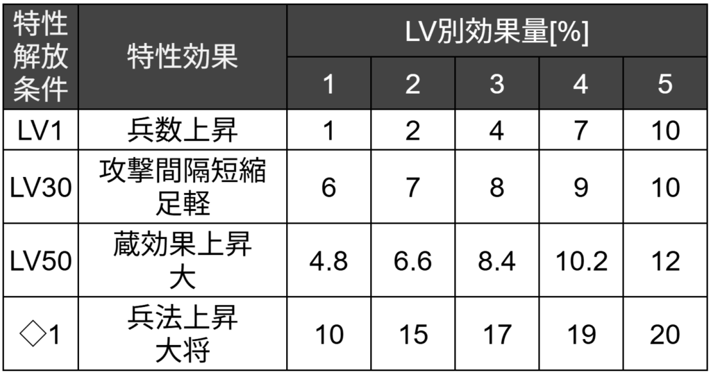 効果量は大きくありませんが、兵種や配置に依存せずに発動できる便利な特性です。