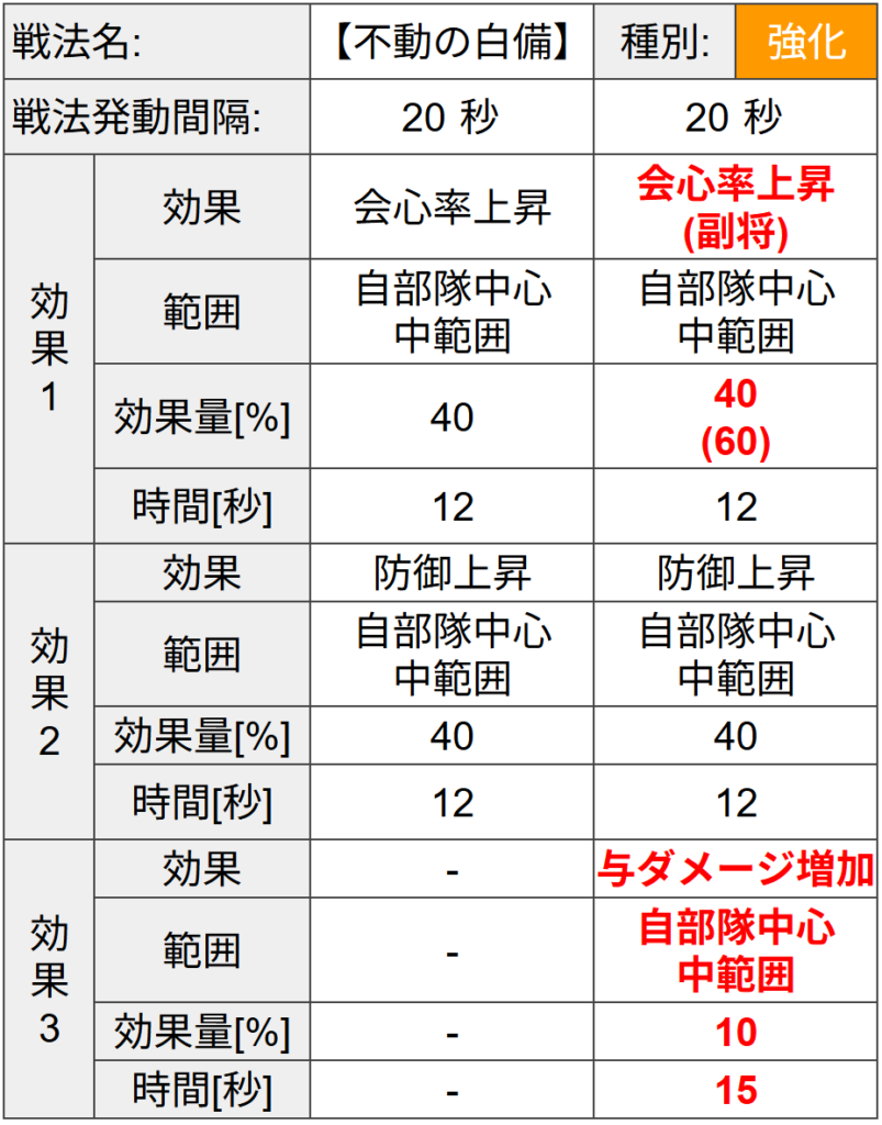 範囲は自部隊中心中範囲、戦法発動間隔は20秒です。
