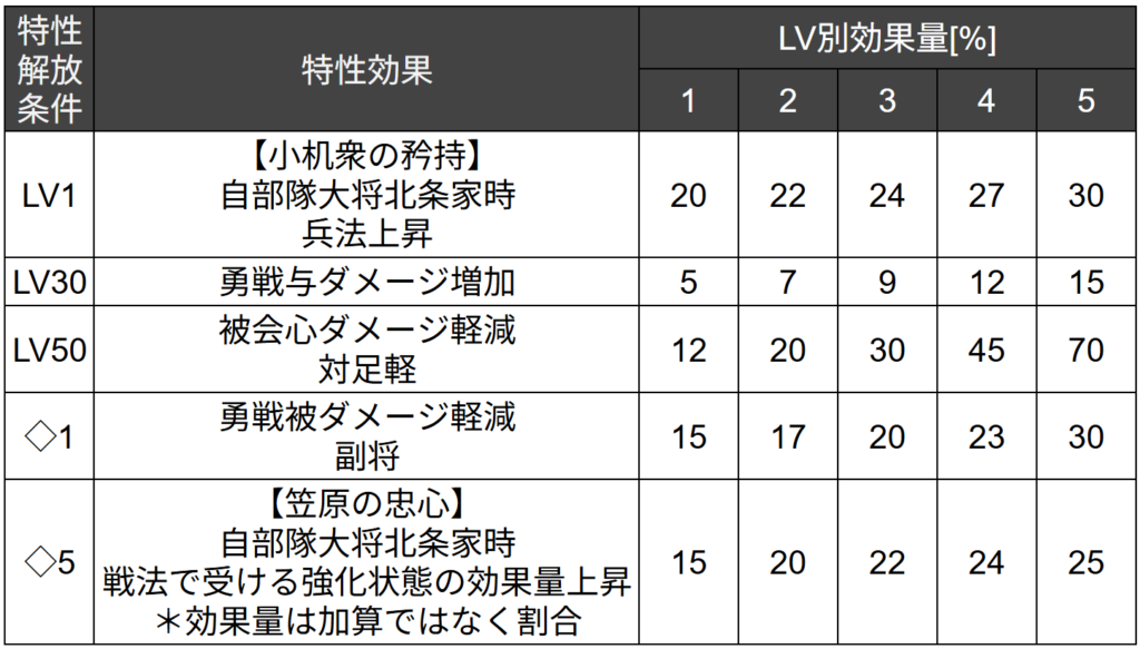 効果は自部隊大将北条家時、戦法で受ける強化状態の効果量上昇です。