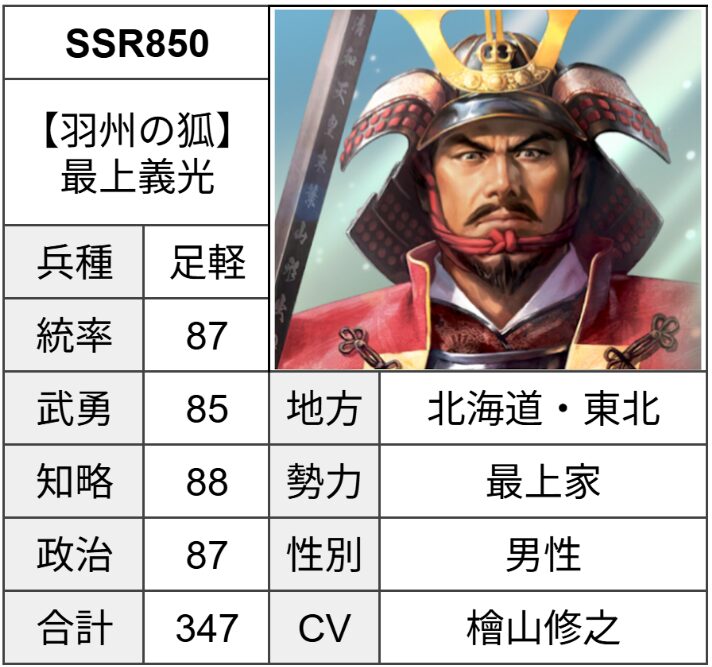 北海道・東北地方全体でも足軽のSSR武将は多いとは言えないため、編成ボーナスに恵まれているとは言い難いです。