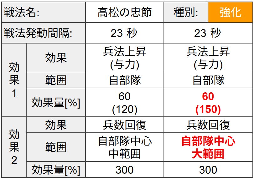 強化すると【兵法上昇】の効果量が上昇し【兵数回復】の範囲が大範囲となります。
