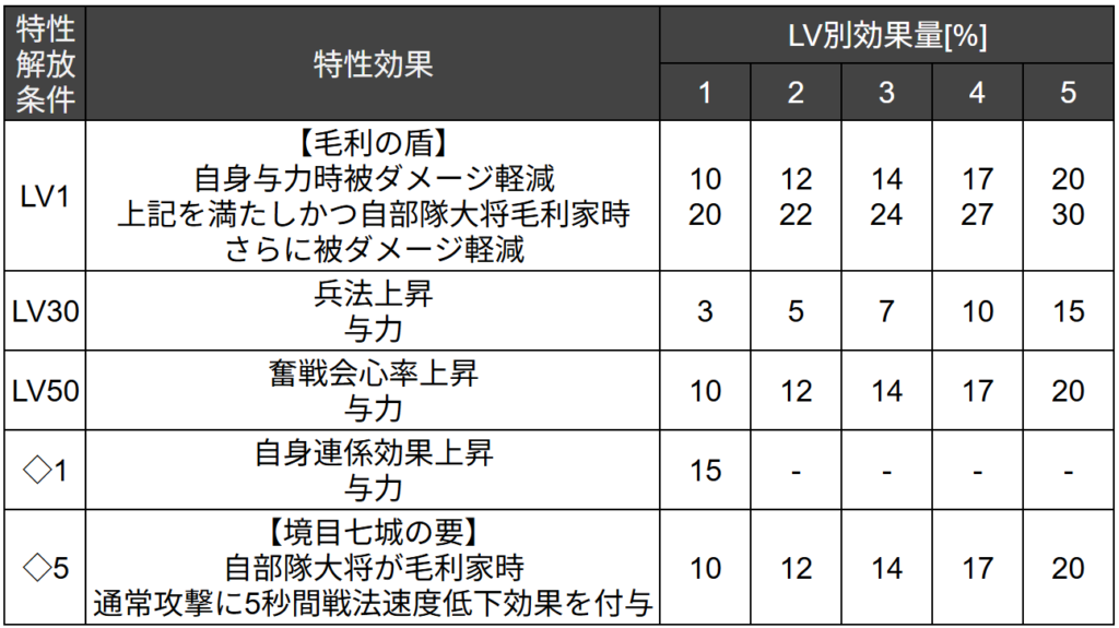 毛利家には被ダメージ軽減系特性を持つ武将は複数います。