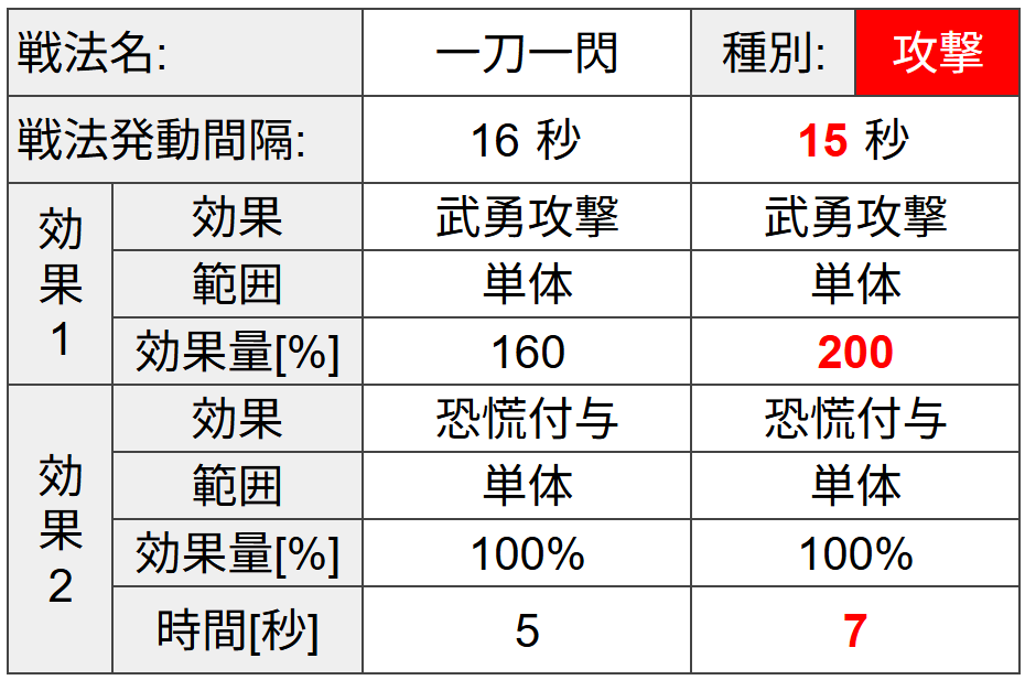 剣豪系の武将は単体を対象とした戦法が多いですが、一刀斎も例に漏れず単体のみの戦法です。