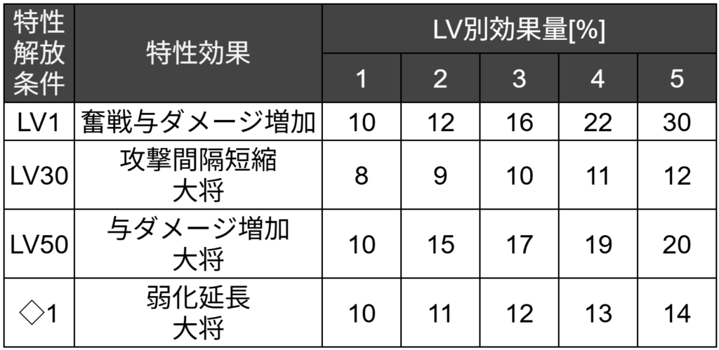 【与ダメージ増加・大将】を持ちます。