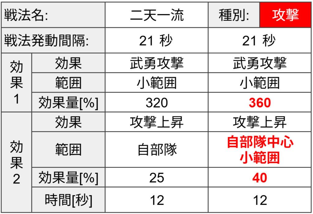 強化することでそれぞれの効果量が上昇し、【攻撃上昇】の範囲が自部隊中心小範囲となります。