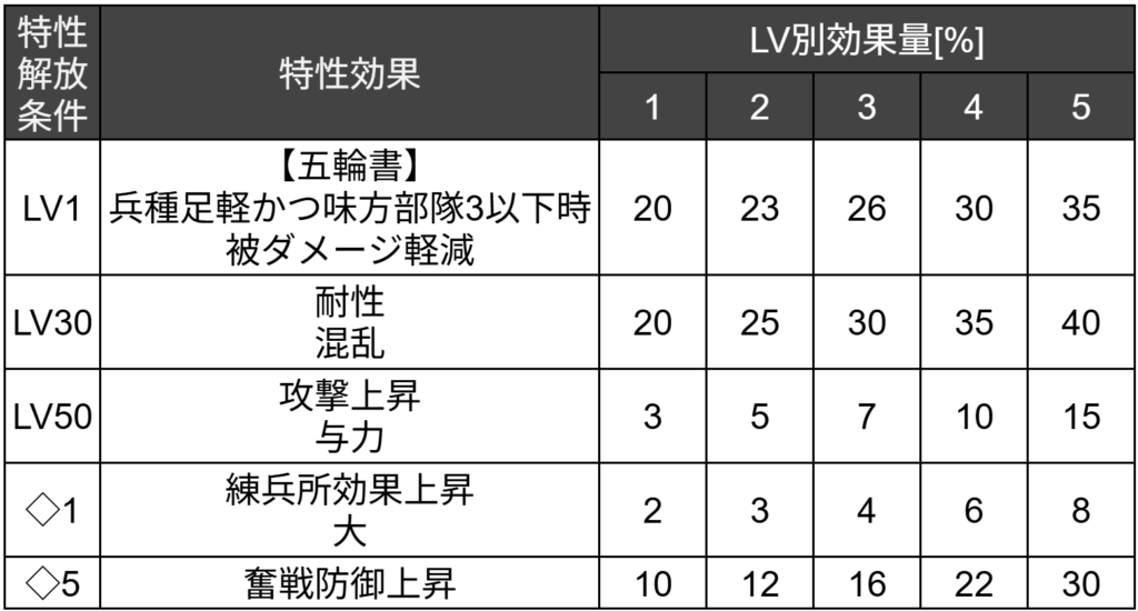 効果は自部隊兵種足軽時かつ味方部隊3以下時被ダメージ軽減です。