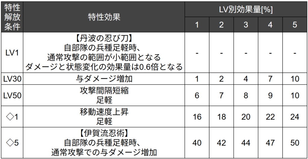 効果は『自部隊兵種足軽時、通常攻撃での与ダメージ40%増加』です。
