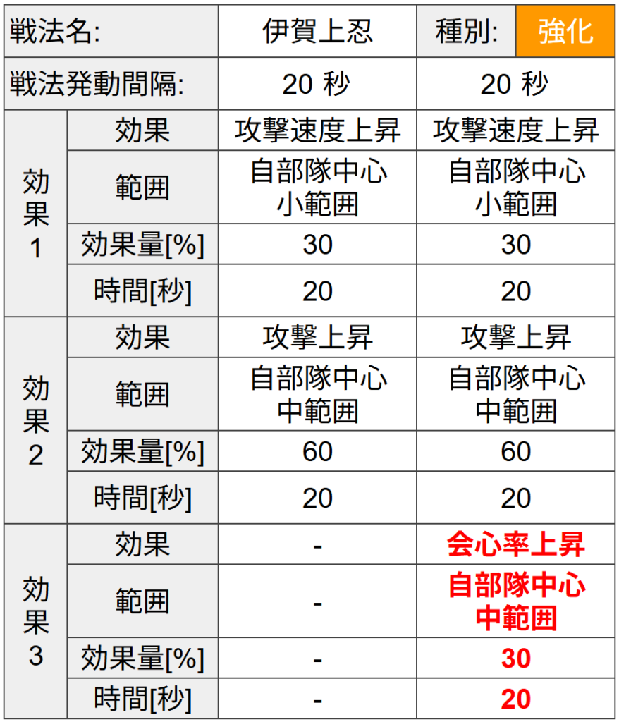 発動間隔が20秒なので強化延長と組み合わせると1発目の戦法効果が切れる前に2発目を撃つ事が可能になり、効果が重ね掛けできます。
