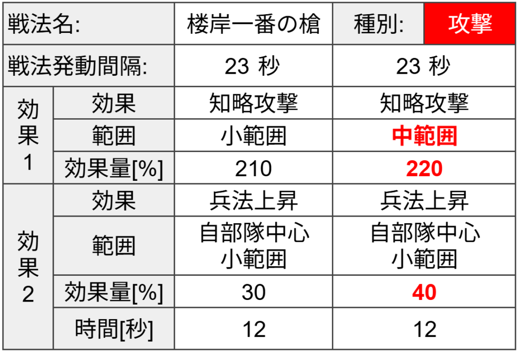 強化することでそれぞれの効果量が上昇し【知略攻撃】は中範囲に拡大されます。