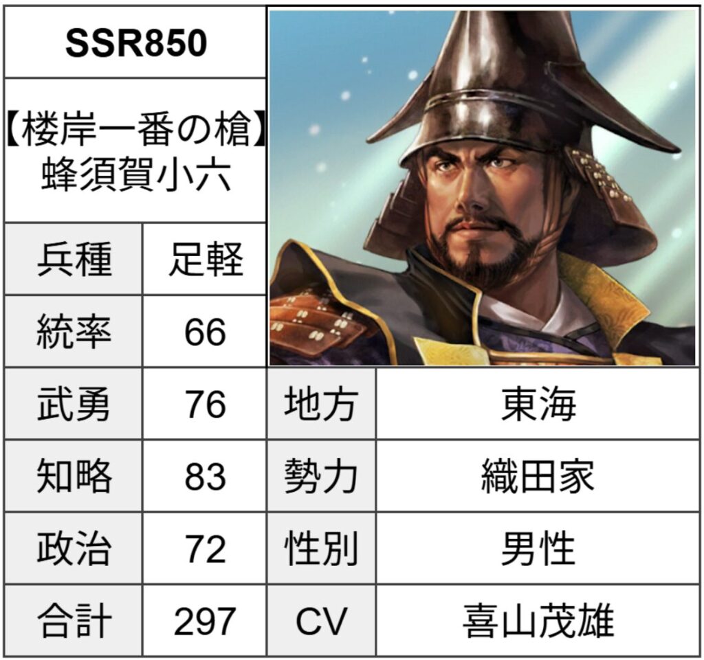 5 | 【楼岸一番の槍】 蜂須賀小六 | 足軽 | 297 | 66 | 76 | 83 | 72 | 東海 |