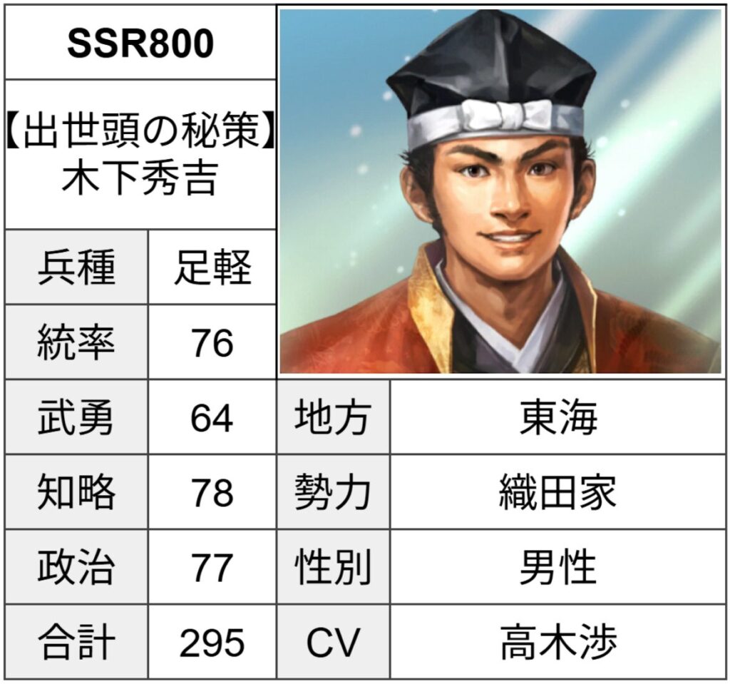 全プレイヤーにとって最初の武将である木下秀吉。
