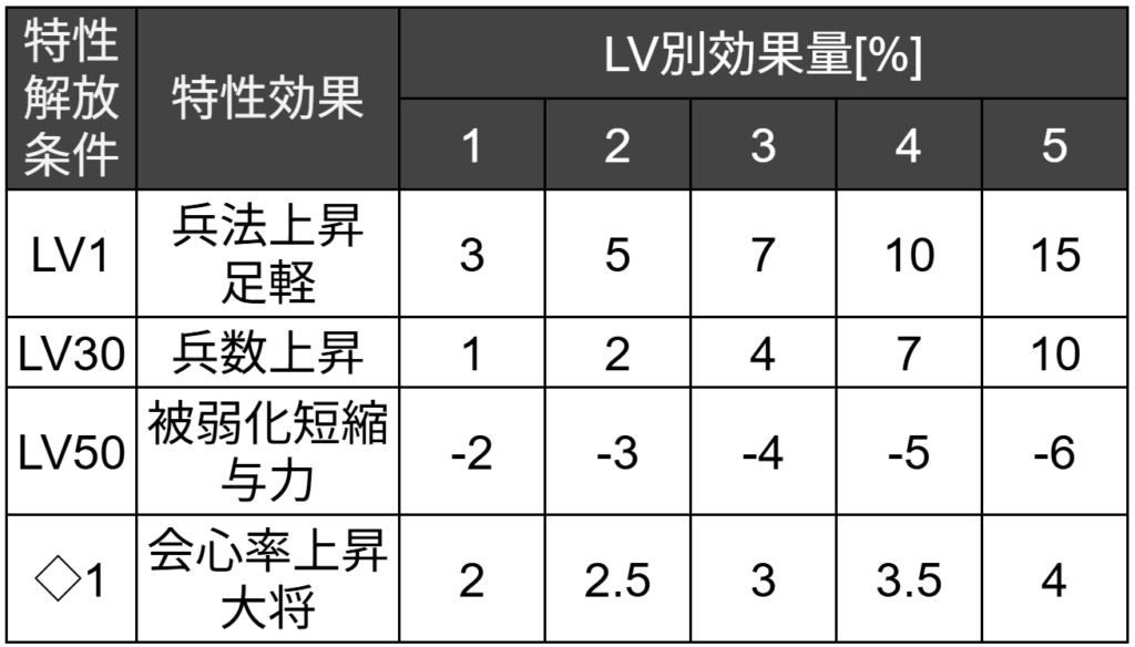 効果量は大きくありませんが、兵種や配置に依存せずに発動できる便利な特性です。