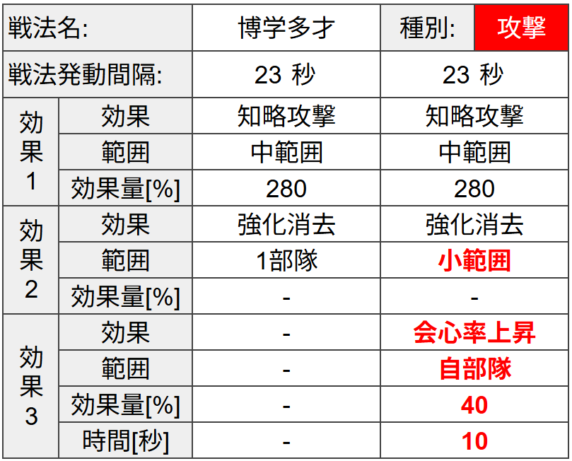 加えて【兵法】が高くなる弱化効果の付与時間が延び、相手から受ける弱化効果の付与時間を短くすることが出来ます。