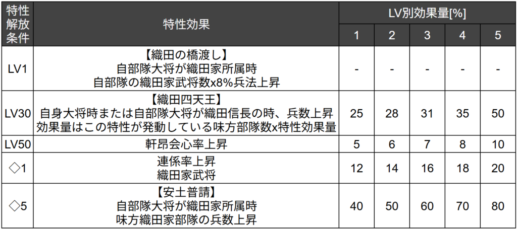 効果は自部隊大将織田家時、味方織田家部隊の兵数上昇です。