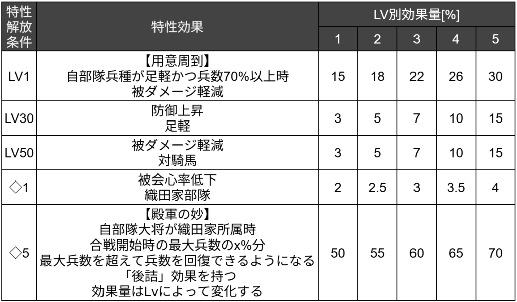 効果は自部隊兵種足軽時かつ兵数70%以上時、被ダメージ軽減。