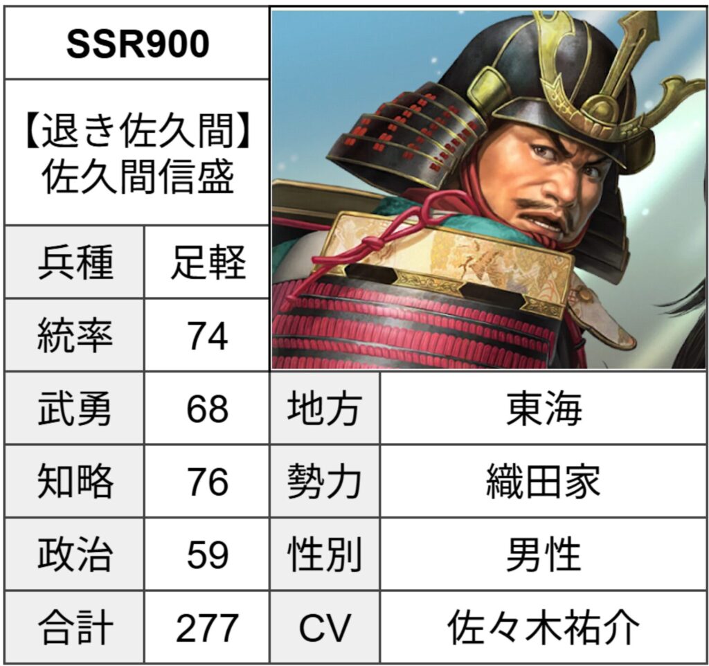 織田家筆頭家老としては控えめな能力値となっており、織田家四天王と比較すると見劣りします。