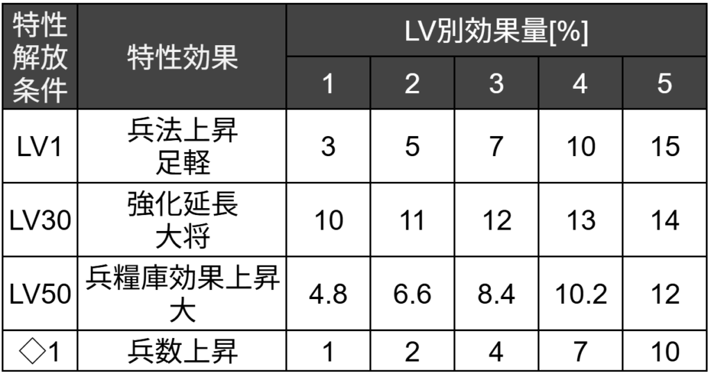 ただし、領地拡大のペースにもよりますが、後半になると兵糧は余りがちになるので特性Lvの強化優先度は高くありません。