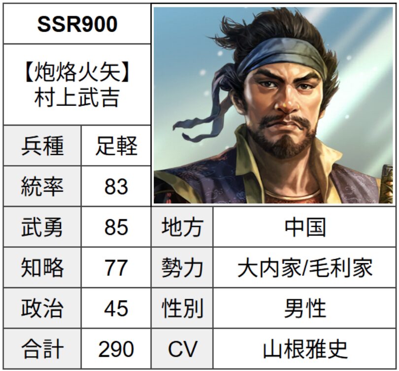【炮烙火矢】村上武吉共闘イベントの第26期【決戦 山中鹿之介】の報酬武将として登場しました。共闘イベントの報酬武将としてこれまで登場したSSR900武将達は再入手機会があったことがこれまで一度もありません。(※2026年4月現在)