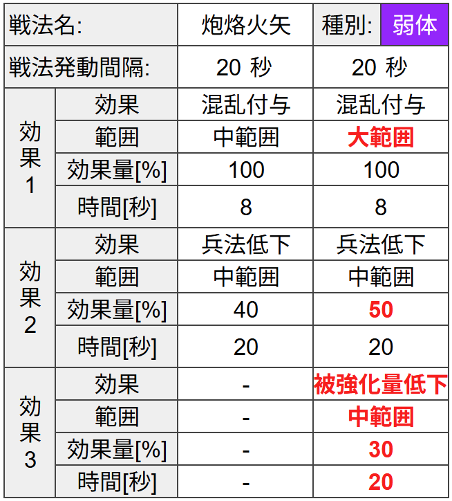 効果は自部隊の兵種が足軽時、戦法による弱化状態の付与時間を延長するというものです。