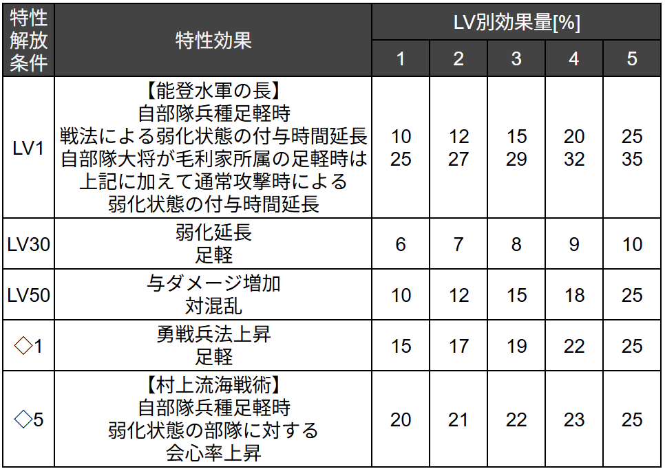 効果は自部隊の兵種が足軽時、弱化状態の部隊に対する会心率が上昇するというものです。