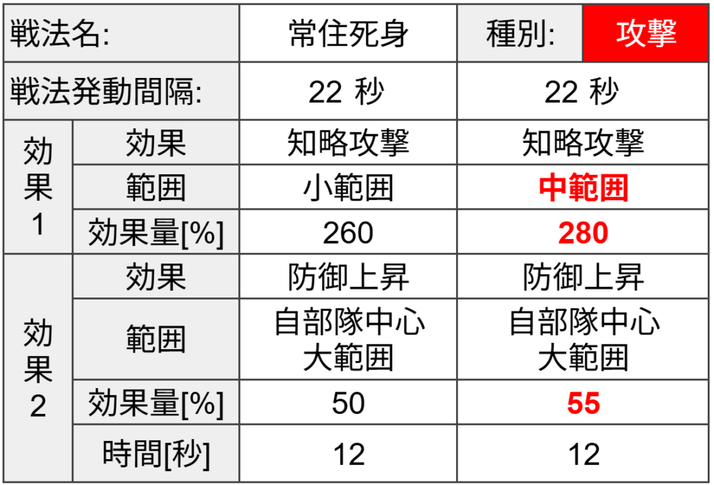 通常攻撃で与える事が出来るダメージが増えるということは、戦法を撃ちあう時間帯まで部隊が生き残れない場合が増えるという事です。