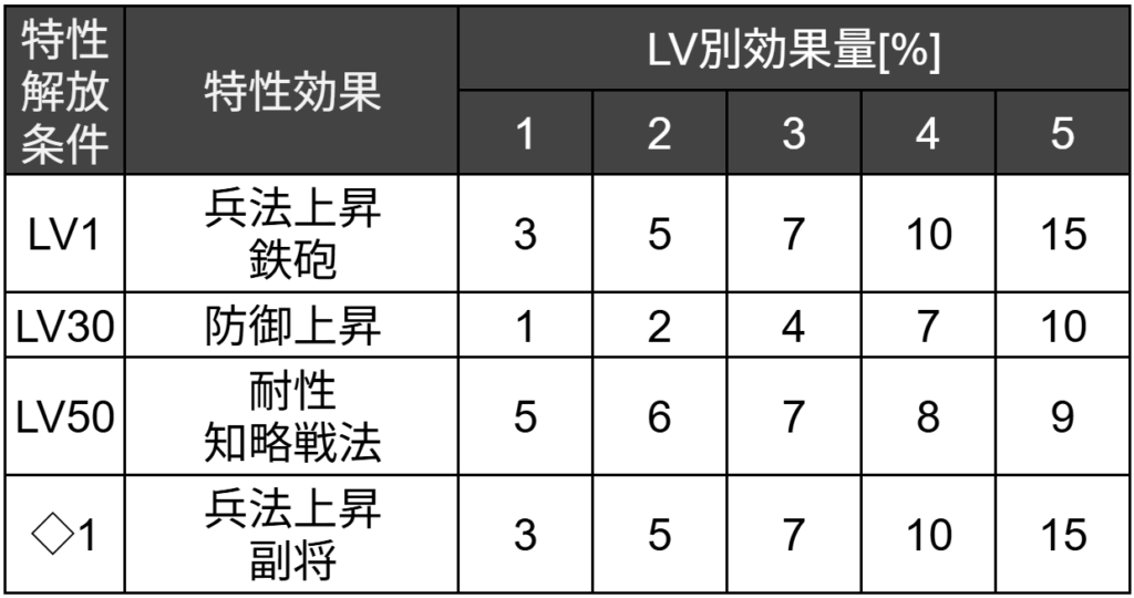 2種の兵法上昇特性を持ち、自身の知略も高いので部隊の兵法を上げるのに向いている武将です。