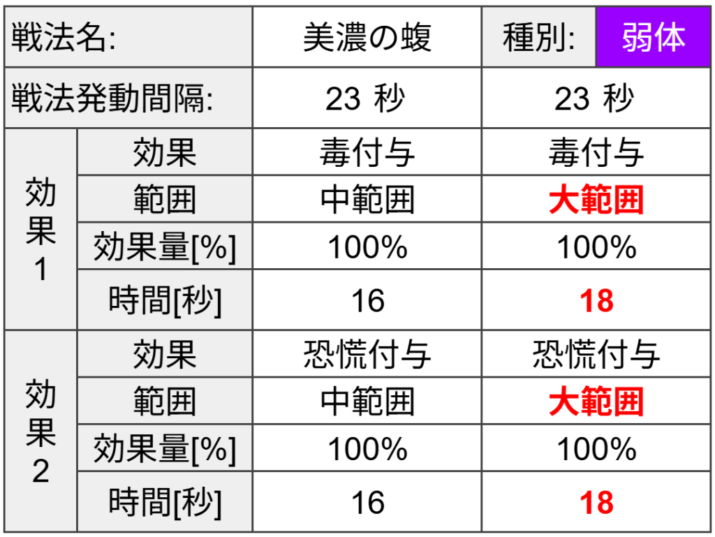 弱化効果の付与時間は自部隊と敵部隊の【兵法】の差で上下します。