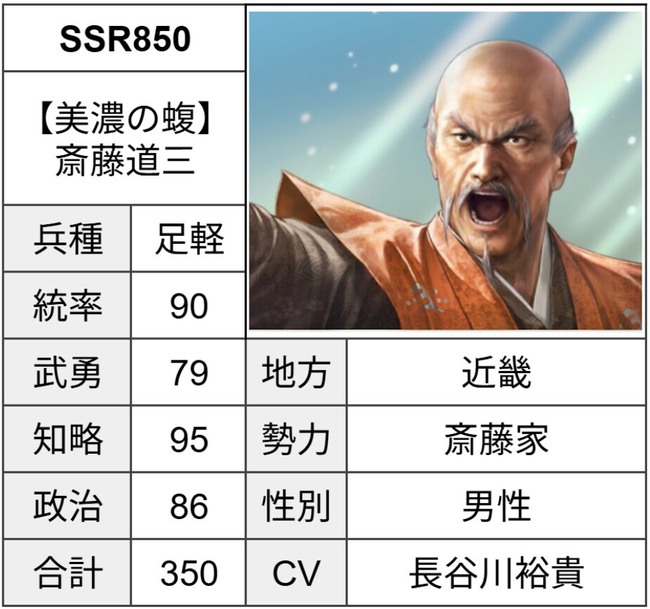 斎藤家のSSR武将は少ないですが近畿地方は足軽SSR武将が多いため兵種一致、地方一致の編成ボーナスを狙えます。